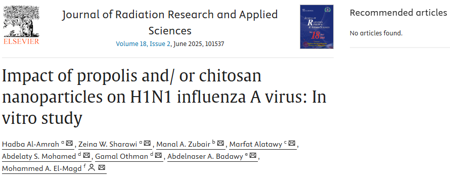 本研究內(nèi)容基于發(fā)表于《Journal of Radiation Research and Applied Sciences》的論文(Impact of propolis and/ or chitosan nanoparticles on H1N1 influenza A virus: In vitro study,DOI:10.1016/j.jrras.2025.101537),由沙特阿拉伯與埃及多所大學聯(lián)合完成。